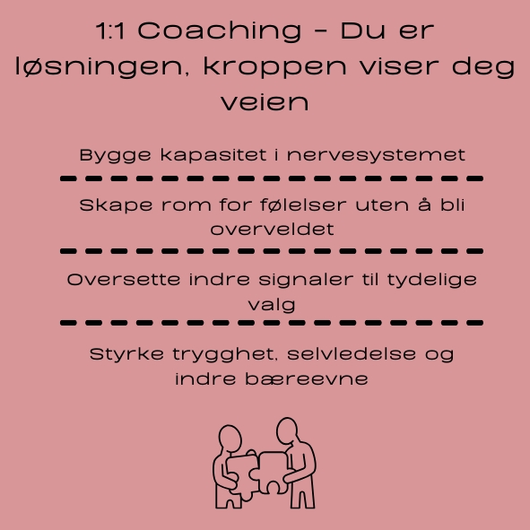 - 1:1 ukentlige coaching sessions i et trygt, regulert rom (fordelt over 3-4 mnd)